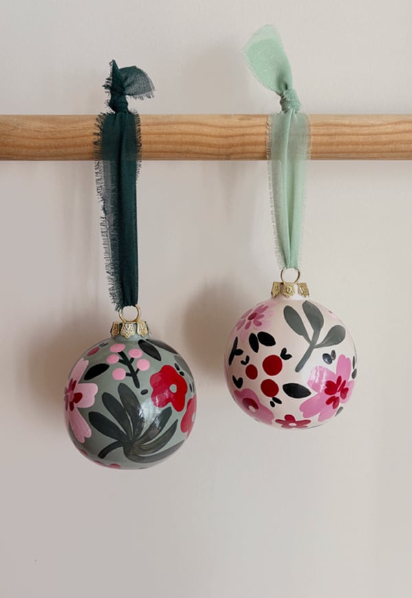 Adornos de cerámica pintadas a mano en tonos verdes, rosas y granate Tamaño: 6,5 cm de diametro. Incluida cinta para colgar . Cada pack tiene 2 adornos navideños.