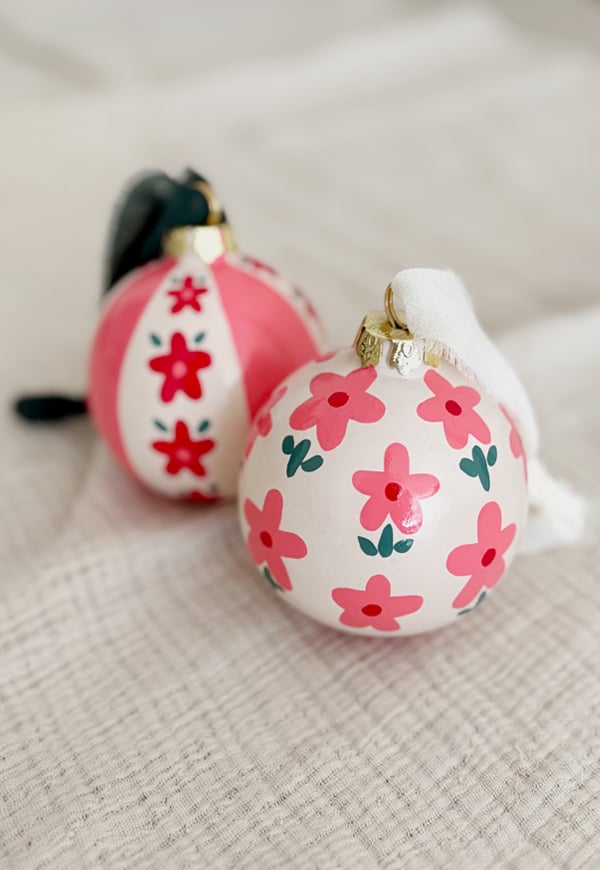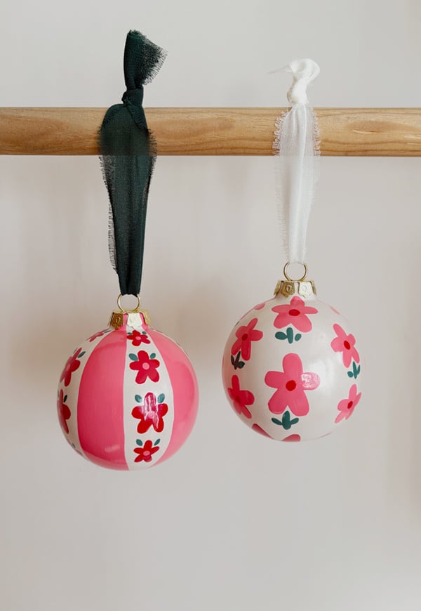 Adornos de cerámica pintadas a mano en tonos rosas, rojo y verde Tamaño: 6,5 cm de diametro. Incluida cinta para colgar . Cada pack tiene 2 adornos navideños.