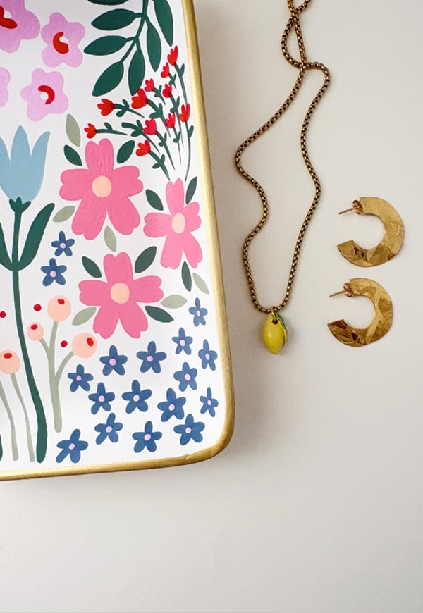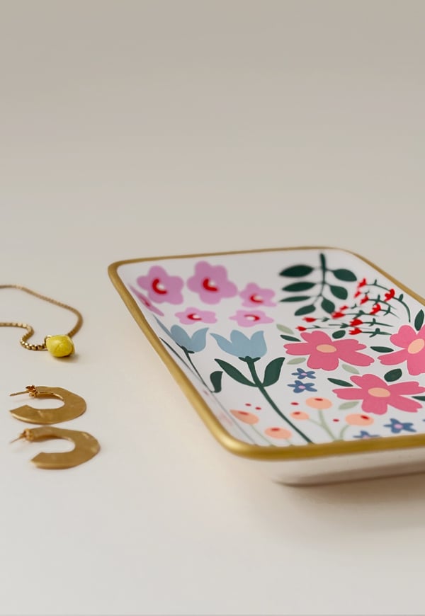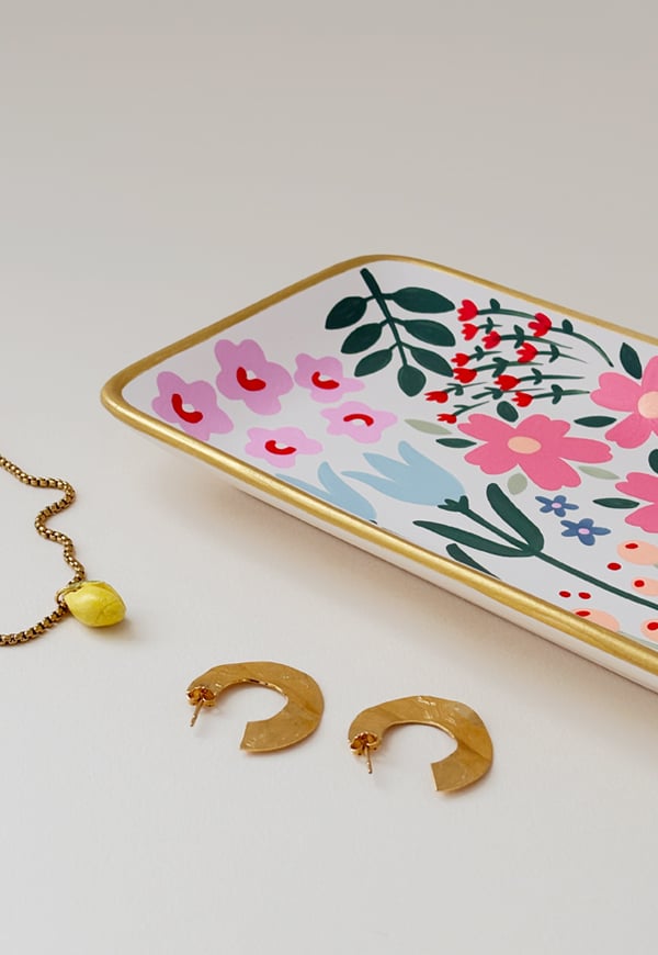 Bandeja de cerámica pintado a mano con el canto dorado.