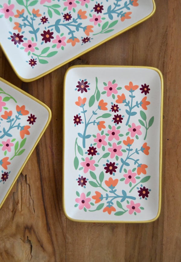Bandeja de cerámica pintado a mano con el canto dorado.