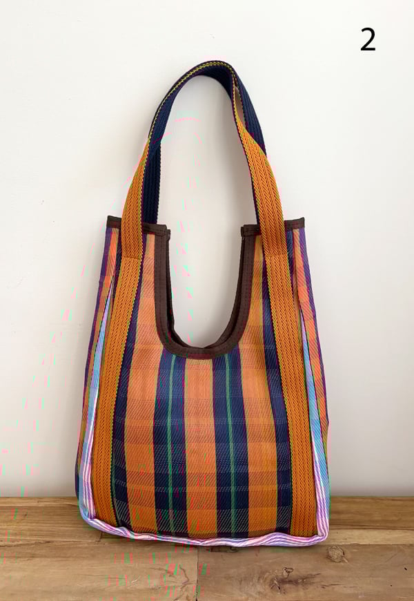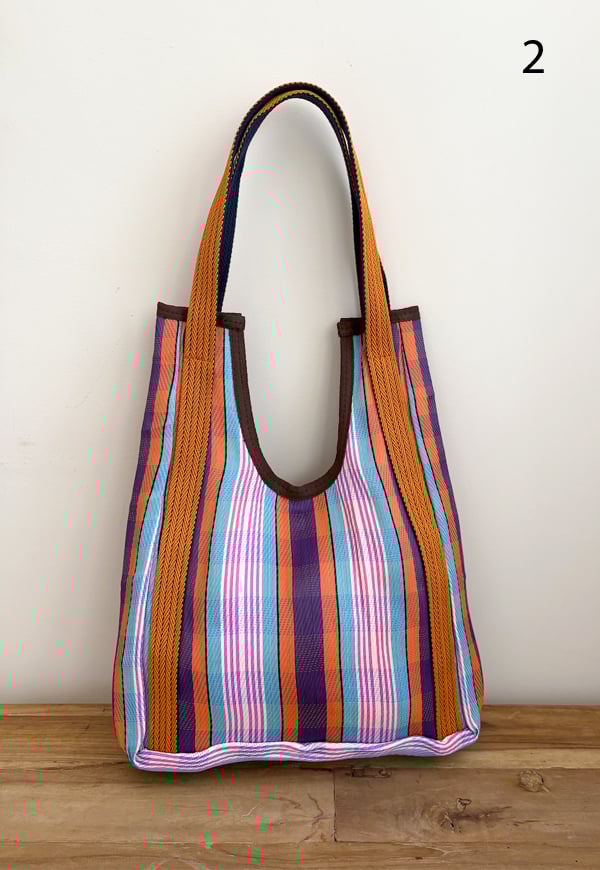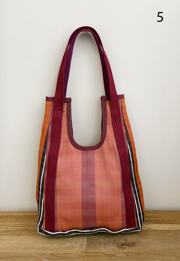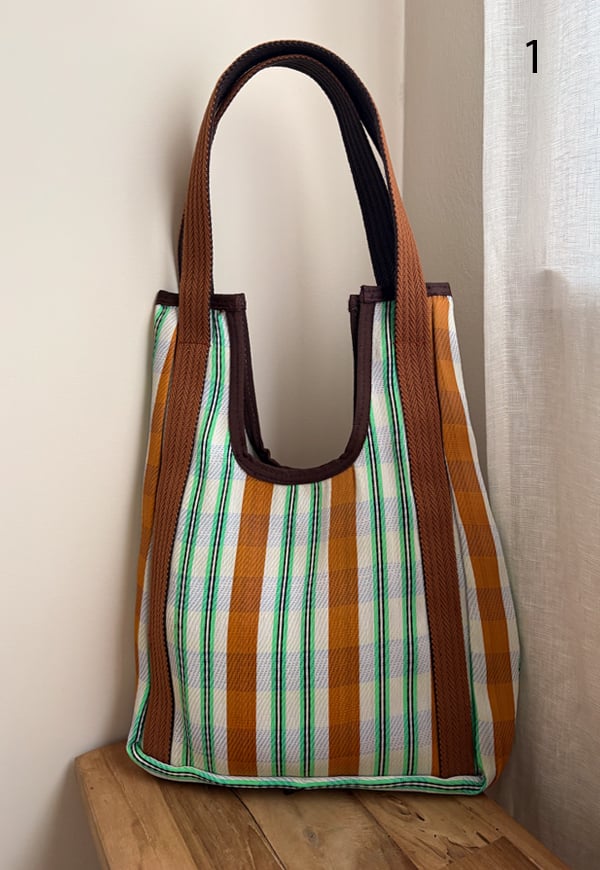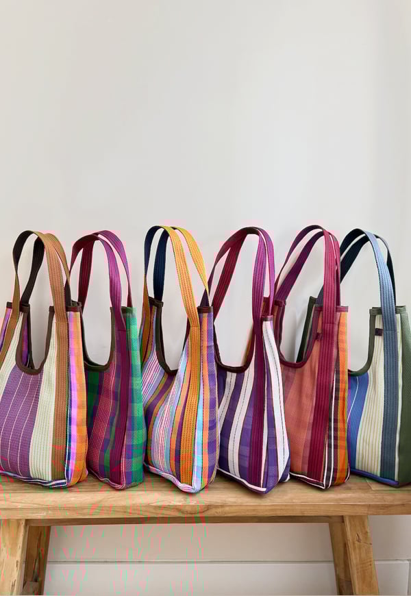 Bolsos ligeros con diseño de rayas hechos de material reciclado y cintas de algodón.