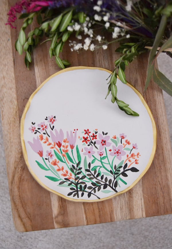 Plato de cerámica decorativa hecha y pintada a mano con el canto dorado.